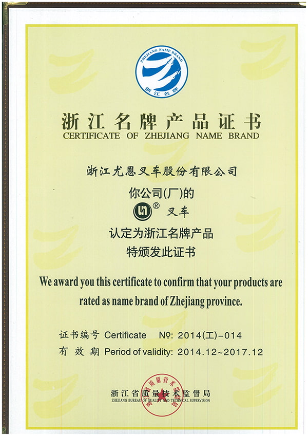 Компания UN Forklift получила сертификат на продукцию известного бренда Zhejiang, выданный Бюро качества и технического надзора провинции Чжэцзян. Этот сертификат является известным знаком признания бренда корпоративной продукции Чжэцзяна.
